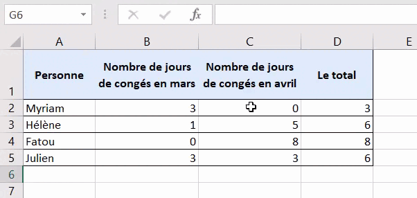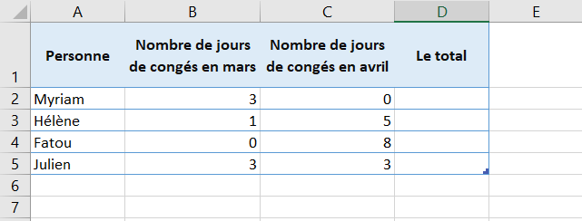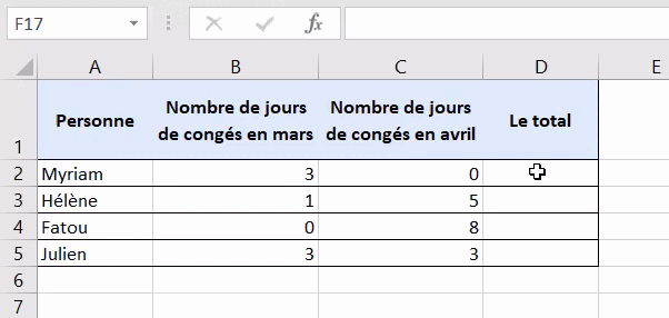 Bien sûre, il serait possible et même rapide de calculer tout ceci de tête et de remplir le total pour chaque personne manuellement. Ce serait d’ailleurs un excellent exercice de calculs mental. Mais qu’allez-vous faire si chaque personne de l’équipe décide d’annuler ou de rajouter des jours de congés au fur et à mesure ? Vous pouvez prendre le temps de refaire vos calculs à chaque modification de ce tableau. Ou vous pouvez écrire des formules et Excel se chargera de refaire le calcul automatiquement pour vous à chaque fois que le tableau changera comme vous pouvez le voir sur l’illustration ci-dessous :