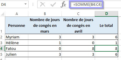 Nous cherchons tout d’abord à savoir combien de jour de congés Myriam a prévu en mars et en avril. On se place alors sur la cellule correspondant au total de Myriam (en D2). Comme vous pouvez le voir sur la démonstration ci-dessus, pour écrire la formule, comme tout à l’heure, nous commençons par écrire “=so”, puis choisissons la somme. Cette fois-ci, au lieu d’écrire les chiffres 3 et 0 manuellement, nous sélectionnons directement la cellule qui correspond à trois. Nous maintenons appuyé le clic gauche de la souris tout en glissant vers la cellule contenant le nombre de jour de congés du mois d’avril. Puis nous lâchons le clic gauche et appuyons directement sur la touche “Entrée” du clavier. En faisant cela, j’indique que je souhaite calculer la somme de la cellule B2 (qui correspond au nombre de jour de congés en mars pour Myriam) et de la cellule C2 (qui correspond au nombre de jour de congés en avril pour Myriam). Notez que la parenthèse droite a été ajoutée automatiquement à la fin de la formule. Nous n’avons en effet pas eu besoin de l’ajouter manuellement nous-même.