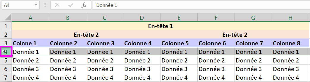 Nous avons ici cliqué sur la 4ème ligne (position encadrée en rose flashy sur l’image ci-dessus), qui correspond en fait à la première ligne qui n’est pas une en-tête.