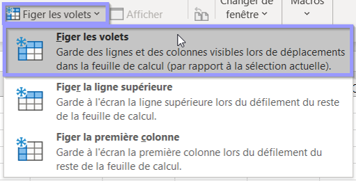 Puis, comme la semaine dernière, rendez-vous dans l’onglet Affichage, puis cliquer sur Figer les volets dans la zone Fenêtre, puis sélectionner Figer les volets.